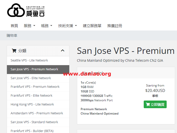 SaltyFish(咸鱼云)推送了最新的春季促销,美国圣何塞CN2 GIA VPS特惠套餐¥280/年,配置为1核/512M内存/8G SSD/1G带宽@600G流量 ,除nano套餐以外,San Jose VPS – Premium Network套餐新购享受7.9折优惠,KVM虚拟化,1Gbps大带宽,国内方向速度不错。此外商家还为当前产品的所有客户提供了一点点的升级(包含存量,控制面板重启生效)